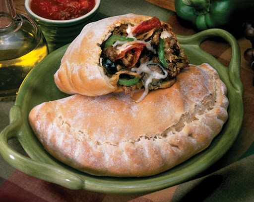Press 3 rolls together and, using a little flour, roll them into a 12-inch circle.Make 3 more circles with the other rolls. Combine pepperoni, sausage, olives, mushrooms, green peppers, cheese and Italian seasoning. Divide mixture equally and spoon onto one half of each circle. Fold dough over (like a turnover) and pinch edges together to seal. Place on a large sprayed baking sheet. Bake at 350°F 20-25 minutes or until golden brown. To serve, dip in heated pizza sauce.