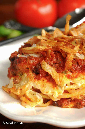 Layered spaghetti casserole topped with french fried onions. A family favorite!