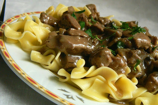 Cut meat into one inch squares. Sprinkle with salt and pepper and let stand for 2 hours. Brown flour in butter, work into a smooth paste. Add hot stock gradually. Bring to boil. Strain. Stir in tomato juice and sour cream. Fry the onion; when brown put meat and sauce in with onion; simmer 15 minutes. Bring to quick boil, stir well and serve at once over hot noodles.