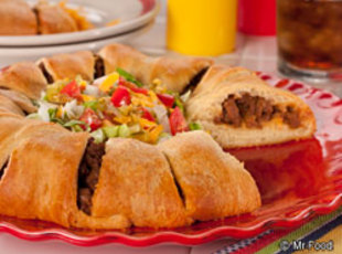 Unroll crescent rolls. Place wide end of triangles in center of pizza pan, forming a ring, overlapping dough as necessary. Spoon meat mixture into center of each triangle. Bring smaller ends of triangles over meat, tucking ends under. Bake 20 minutes, or until rolls are golden. Serve warm.