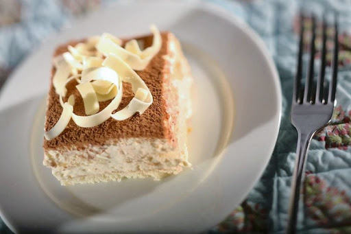 6. Refrigerate just until chilled, about 2 hours. Serve within a few hours of assembly. Before serving, sprinkle over the cocoa powder and top with shaved white chocolate.
