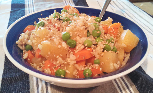 2. Meanwhile, bring pineapple juice to a boil and simmer pineapple chunks, carrot, asparagus, and tamari until veggies are tender but still crunchy, about 5 minutes.