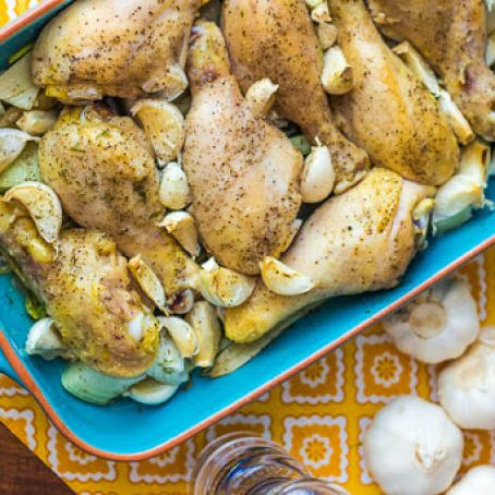 Tuck the garlic cloves in and around the chicken pieces. Cover the casserole tightly with aluminum foil, then the lid.