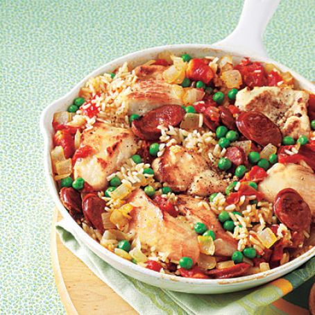 2. Heat remaining oil in skillet and add onion and garlic. Cook, stirring, until softened, about 3 minutes. Add chorizo and cook until lightly browned, about 2 minutes. Stir in rice, broth, tomatoes and 1/2 tsp. salt. Bring to a boil, add chicken, cover, reduce heat to low and cook until rice is tender and chicken is cooked through, 10 to 12 minutes.