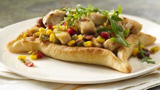 4 In small bowl, toss arugula with remaining 1 tablespoon of the olive oil, 1/8 teaspoon salt and 1/8 teaspoon pepper. Top rafts with chicken mixture and arugula.