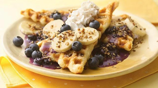To serve, stack 2 crescent waffles, slightly overlapping, on each of 4 serving plates. Spoon 1/4 of the fruit sauce over each serving; top each serving with 1/4 of the banana slices and 1 tablespoon of the pecans. Top with whipped cream; sprinkle lightly with cinnamon. Garnish with blueberries.