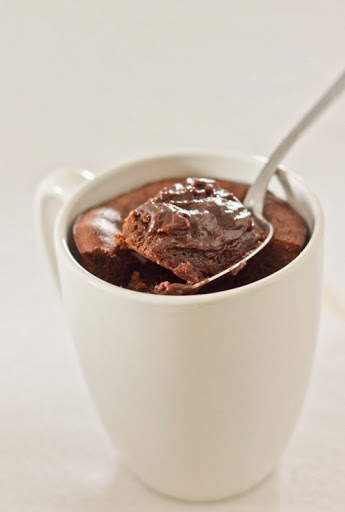 6 Evenly divide the chocolate batter among the coffee mugs using a small scoop or spoon. Place the mugs on a baking pan and place in the oven.