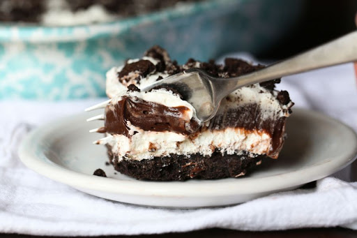 In a food processor, finely crush 50 of the sandwich cookies. Pulse in melted butter, until combined. Press mixture evenly into bottom of a 9x13-inch pan. Set aside.