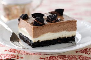 BEAT cream cheese, sugar and vanilla in large bowl with mixer until well blended. Add sour cream; mix well. Add eggs, 1 at a time, beating after each just until blended; pour half over crust. Stir melted chocolate into remaining batter; pour over batter in pan. Chop remaining cookies; sprinkle over batter.