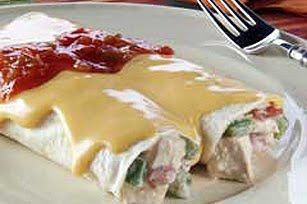 SPOON 1/3 cup chicken mixture down center of each tortilla; roll up. Place, seam-sides down, in lightly greased 12x8-inch baking dish; set aside.