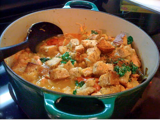 Coarsely chop the bread in food processor into large crumbs, remove blade and toss with melted butter (it melts in 15 seconds in microwave) and the parsley, thyme, salt and pepper. Cover the sausage and chicken with bread and set in oven to brown 2 to 3 minutes. Serve directly from the pot. Keep an eye out for that bay leaf and sprigs!