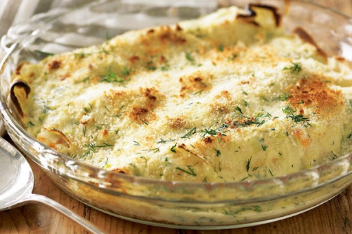 • 1/2 cup cooked, flaked crabmeat or lobster