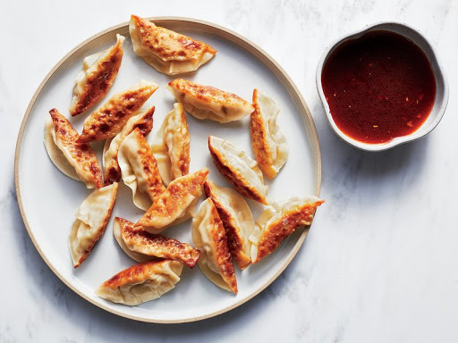 When you hear a gentle frying sound (most of the water is gone), uncover. Fry the dumplings for 1 to 2 minutes to crisp the bottoms. Remove from heat. When the sizzling stops, use a spatula to transfer the dumplings to a plate, with crisp bottoms up. Eat with the dipping sauce.