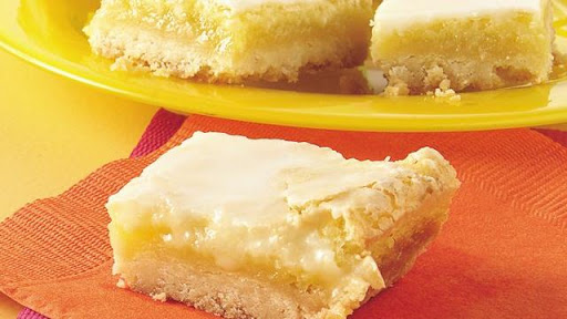 5. In small bowl, mix 1 cup powdered sugar and enough lemon juice for desired spreading consistency until smooth. Spread glaze over cooled bars. Cut into bars.