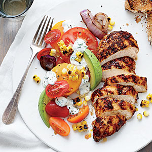 4. Slice chicken. Arrange 1 breast on each of 4 plates. Arrange 2 yellow and 2 red tomato slices on each plate. Top each serving with 1/4 cup cherry tomatoes. Divide corn, onion, and avocado evenly among plates. Sprinkle 1/4 teaspoon salt over salads. Drizzle about 1 1/2 tablespoons dressing over each salad.