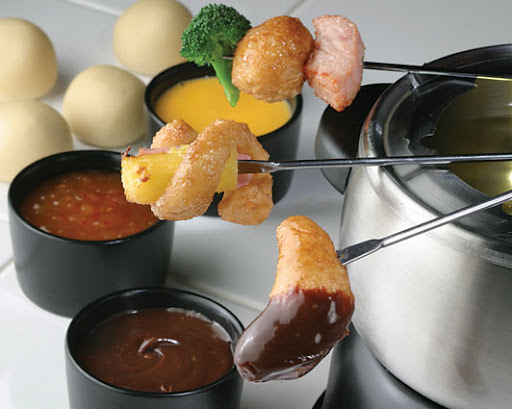 For cheese, broccoli and chicken, cut rolls in fourths. Wrap each fourth around cheese cube, enclosing completely. Place chicken, doughwrapped cheese and broccoli on fondue fork. Fry in heated oil until golden brown. Cool slightly and dip in cheddar and bacon fondue.