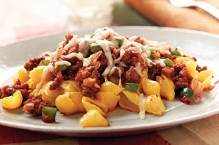 PREPARE Dinner as directed on package. While Macaroni is cooking, brown meat with peppers and onions in large skillet; drain. Stir in pizza sauce.