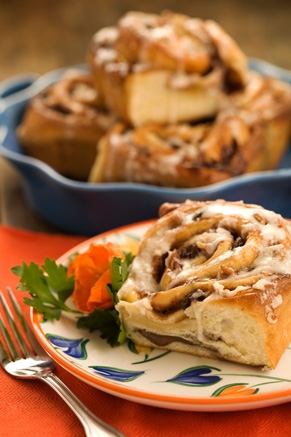 Meanwhile, mix butter, powdered sugar, and vanilla. Add hot water 1 tablespoon at a time until the glaze reaches desired consistency. Spread over slightly cooled rolls.