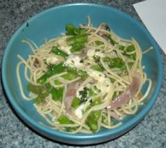 Cook the asparagus in a large pot of boiling salted water until crisp tender, about 2 to 3 minutes. With a spider or slotted spoon, remove asparagus from boiling water to a bowl of ice water to cool and stop the cooking. When cool, strain, cut asparagus into 1" pieces, and set aside.