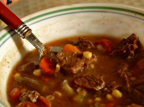 Cover and simmer for one hour. Add mushrooms and potatoes and simmer 20 minutes more until all is tender.