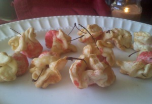 Simply take Maraschino Cherries (in the jar-with the stems on) and let them dry on a paper towel while you prepare the store bought pie crust.
