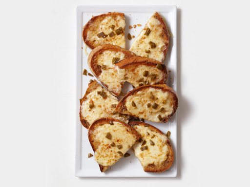 Broil sourdough bread on a baking sheet until golden, then flip and spread with the cheese mixture. Top with chopped pickled jalapenos and a dash of paprika. Broil until the cheese is melted and bubbly, then cut each slice in half.