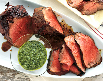 Prepare barbecue (high heat). Pat beef dry with paper towels; brush with oil. Sprinkle all over with spice rub, using all of mixture (coating will be thick). Place beef on grill; sear 2 minutes on each side. Reduce heat to medium-high. Grill uncovered until instant-read thermometer inserted into thickest part of beef registers 130°F for medium-rare, moving beef to cooler part of grill as needed to prevent burning, and turning occasionally, about 40 minutes. Transfer to platter; cover loosely with foil and let rest 15 minutes. Thinly slice beef crosswise. Serve with chimichurri sauce.