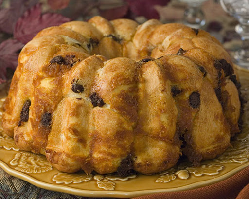 Pour pudding mix into a bowl. Cut 12 of the rolls in half and dip in dry pudding mix. Place in sprayed bundt pan. Sprinkle half of the chocolate chips over rolls. In a saucepan, melt butter and sugar together to form a syrup. Remove from stove top and stir in pumpkin pie mix. Pour half of this mixture over rolls in bundt pan. Repeat the above process with remaining 12 rolls. Sprinkle any remaining pudding mix over the top. Cover with plastic wrap and let rise to one inch below the top of the pan. Remove wrap and bake at 350°F 40-45 minutes. Cover with foil last 10 minutes of baking, if necessary, to prevent over browning. Remove from oven and invert onto serving platter.