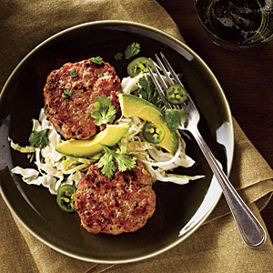 2. Heat a large skillet over medium-high heat. Add 1 tablespoon canola oil to pan; swirl. Add 6 patties to pan; cook 2 1/2 minutes on each side or until done. Remove from pan. Repeat procedure. Serve with Cabbage Slaw.