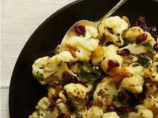 Spoon sauce onto a platter. Top with cauliflower, and sprinkle with raisins and almonds.