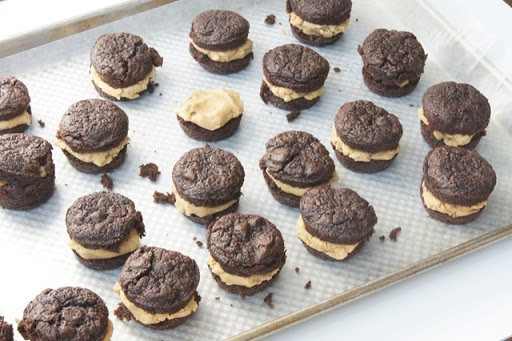 Take 1.5 squares of cookie dough and press into bottom of cupcake pan. Place a peanut butter cup on top of cookie dough placed upside down. Top with prepared brownie mix, filling 3/4 full. Bake at 350 degrees for 18 minutes.