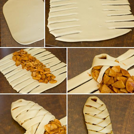 Place your filling in the center on the un-cut part of the dough, and then start at one end and criss-cross the 1 inch strips as shown in the picture.
