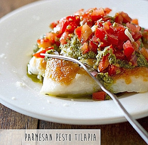 Preheat broiler. Pat the tilapia dry with a paper towel. Place on a baking sheet lined with foil. Coat the foil with cooking spray or olive oil to prevent sticking. Sprinkle each fillet with 2 Tbsp. of Parmesan cheese. Broil for 10-11 min. or till the fish is no longer translucent & the cheese is browned on top. Top each fillet with fresh tomatoes & a Tbsp. of pesto. If you have any remaining cheese, add just a tiny bit over the top of the fish, tomatoes & pesto; serve immediately.