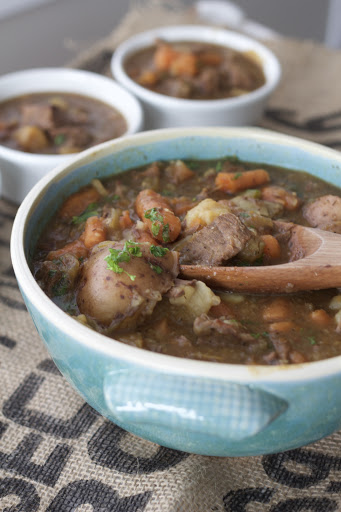 Pour olive oil into the pot. Place the meat into the pot, season generously with salt and pepper (this is in addition to the salt and pepper added with vegetables). Add flour to the meat and saute on high until the meat is browned a bit. This takes about 2-3 minutes. Toss meat around so the flour is not visible and the meat browns.