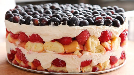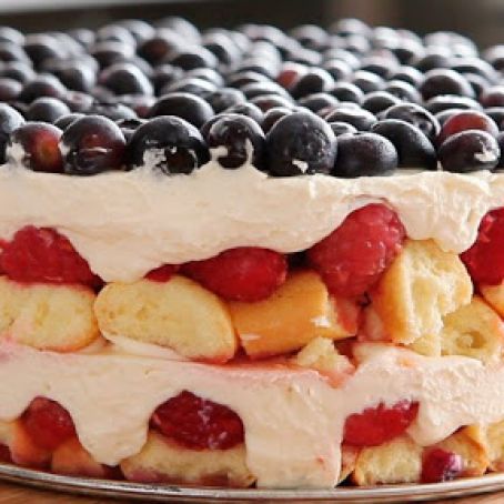 2. Cut one or two pieces parchment 1 inch taller than side of an 8-inch springform pan and line inside of pan. Place half the ladyfingers in pan and top with half the raspberry mixture. With a small offset or rubber spatula, spread half the whipped cream over berries. Tap pan gently on counter to remove air bubbles. Repeat with remaining ladyfingers, raspberry mixture, and whipped cream. Top with blueberries and refrigerate until whipped cream is stiff and cookies have softened, about 3 hours (or, tightly covered with plastic, up to 3 days). To serve, unmold trifle and peel away parchment.