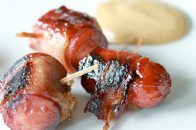 Place bacon on a wire rack over a baking sheet and par cook in a 400 degree oven until beginning to show signs of browning, about 10 minutes. Slice Polish sausage or kielbasa into 24 chunks. Wrap each chunk with 1/2 slice of bacon and secure with toothpick. Add a teaspoon or so of brown sugar to the tops of each piece. Place in a shallow pan and smoke until bacon has crisped and brown sugar has melted into a glaze.