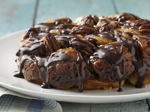 5 In 1-quart saucepan, heat cream over medium heat just to boiling. Remove from heat. Stir in chocolate chips until melted and smooth. Drizzle over monkey bread. Serve warm.