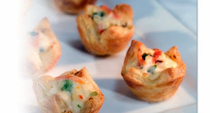 Preheat oven to 400°. Unfold pastry sheets and roll each sheet into 12 x 8 -inch rectangle. Cut each rectangle into 24 squares, about 2-inches each. Press squares into mini muffin pans. Combine remaining ingredients in medium bowl. Generously fill pastry shells with vegetable mixture. Bake 15 minutes or until golden brown and puffed; serve warm.