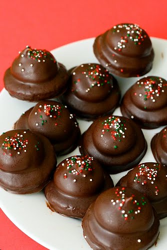 To make the cookie base, in the bowl of a stand mixer fitted with the paddle attachment, combine the dry ingredients and mix on low speed to blend. Add the butter and mix on low speed until sandy. Whisk the eggs together in a small bowl, then add to the dough and mix on low speed to incorporate. Form the dough into a ball, wrap tightly in plastic wrap, and refrigerate for at least 1 hour (or up to 3 days). When ready to bake, preheat the oven to 375° F. Grease a cookie sheet, or line sheet with parchment paper or a silicon baking mat. Roll the dough out to 1/8″ thickness on a lightly floured surface. Use a 2-inch round cookie cutter to cut out rounds of the dough and transfer them to the prepared baking sheet. Bake for about 10 minutes or until light golden brown. Let cool on the baking sheet for a few minutes, then transfer to a wire rack to cool completely. To make the marshmallow, combine the water, corn syrup and sugar in a medium saucepan and bring to a boil. Meanwhile, sprinkle the gelatin over the cold water in a small bowl. Set aside and let dissolve. Continue heating the sugar mixture in the pan until it reaches the soft-ball stage (235° F on a candy or instant-read thermometer). Remove the syrup from the heat, add in the softened gelatin, and mix to combine. In the clean, dry bowl of a stand mixer fitted with the whisk attachment, beat the egg whites on medium-high speed until soft peaks form. Pour the syrup and vanilla extract into the egg whites and continue whipping until the stiff peaks form. Transfer the mixture to a pastry bag and pipe dollops of marshmallow onto the cooled cookie bases. Let set at room temperature for 2 hours. To make the chocolate glaze, combine the chocolate and the oil in a heatproof bowl set over simmering water. Heat until the chocolate is completely melted and a smooth glaze has formed. Place a cookie a a time onto a fork, spoon the chocolate glaze over the top until the cookie is covered, and gently shake off the excess. Transfer the glazed cookies to baking sheets lined with wax paper, garnish as desired, and let the glaze set. (I popped mine into the refrigerator for a few minutes to speed up this process.)