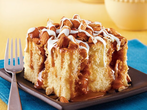 3 Poke warm cake every inch with handle of wooden spoon. Slowly pour condensed milk over cake. Let stand until milk has been absorbed into cake, about 5 minutes. Slowly drizzle with most of caramel sauce, pressing slightly into holes. Sprinkle with almonds. Drizzle with remaining caramel sauce. Cool completely. In small microwavable bowl, microwave frosting on High 10 to 15 seconds. Drizzle over cake. Cut into 6 rows by 3 rows.