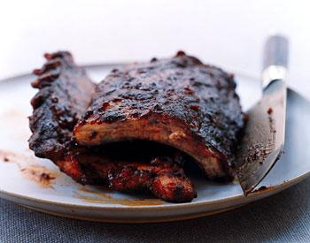 To cook ribs using a charcoal grill: Lightly oil grill rack, then transfer ribs to area of rack with no coals underneath, reserving pan juices, and cook, covered with lid, basting generously with pan juices and sauce and turning over and rotating ribs every 10 minutes (keep ribs over indirect heat), until tender and browned, 30 to 40 minutes total. Transfer ribs to a cutting board and let stand 5 minutes before cutting into individual ribs.