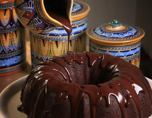 To prepare cake, adjust oven rack to lower-middle position and preheat oven to 350 degrees. Generously butter a 12-cup Bundt pan and dust with cocoa powder, tapping out excess. Place bittersweet chocolate in a small heatproof bowl. Add boiling water, whisk until smooth, cool to room temperature and reserve.
