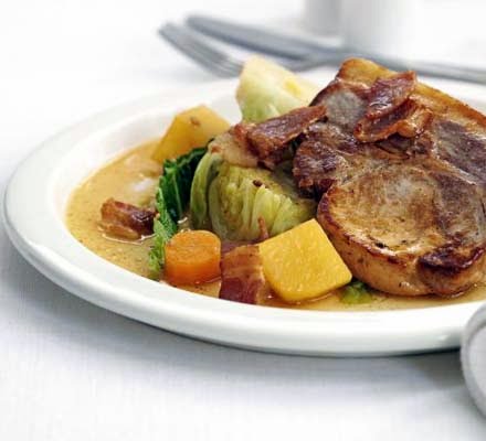 2. Tip the bacon, carrot, potatoes and swede (Rutabaga) into the pan, then gently fry until slightly colored. Stir in the cabbage, sit the chops back on top, add the bay leaf, then pour over the cider and stock. Cover the pan, then leave everything to gently simmer for 20 minutes until the pork is cooked through and the vegetables are tender.