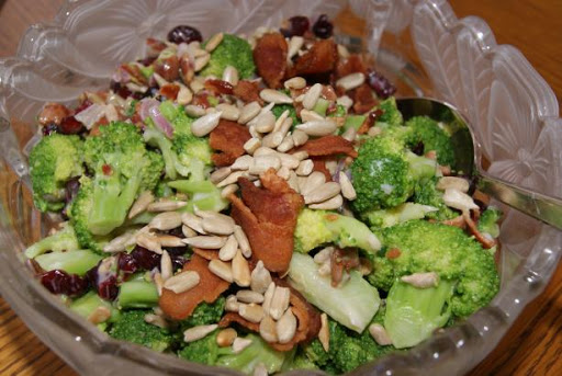 This is from Trisha Yearwood's 1st cookbook, Georgia Cooking in an Oklahoma Kitchen that she wrote with her mom and sister. This is my husband's favorite broccoli salad. Trisha says "This is great served with barbecued pork ribs or prepared to take to a covered dish supper, because it's sturdy enough to stand at room temperature for a while without wilting. It also adds great color to a picnic spread." I've entered it as written, but we like to use red onion and golden raisins. Preparation time includes chilling time.