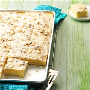 For frosting, combine butter and milk in a large saucepan; bring just to a boil. Remove from heat; gradually stir in confectioners' sugar and extract. Stir in walnuts. Spread over warm cake.