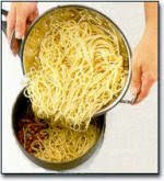 In making Pasta, make sure the water is boiling rapidly and that only salt is added. Do not add oil to the cooking water, stir often to eliminate sticking. Do not cover the cooking pasta. Cook the pasta "alla dente" and do not rinse the pasta before using. If you are not using the pasta immediately, I recommend that you retain the pasta water, keeping it hot, and re-immerse your cooked pasta before using. Hot pasta straight from the strainer is best.