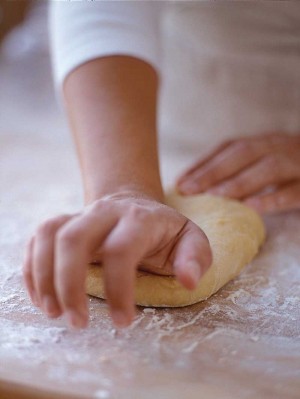 Clear away most of the excess flour on the work surface. Shape the dough into a ball by rolling it in a circle with both hands, applying pressure to the bottom so that the dough tucks under itself and the ball tightens up a little. Cover the ball with a large overturned bowl and let it rest for 30 minutes before rolling. Makes about 1 pound.