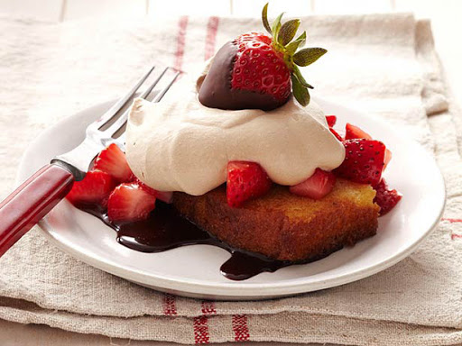 Drizzle some chocolate syrup on each plate; top each with a piece of pound cake. Top with some of the chopped strawberries and their juices, a dollop of the chocolate whipped cream and a chocolate-covered strawberry.