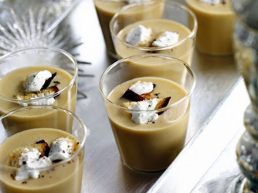 Smear the toasted bread generously with goat cheese and cut into 3/4-inch croutons. To serve, ladle the soup into shot glasses, top with goat cheese croutons and sprinkle with black pepper.