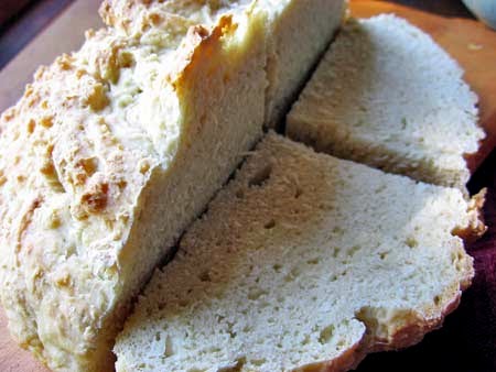 Irish soda bread is a very basic quick bread made from just four ingredients - flour, baking soda, salt, and buttermilk. The baking soda reacts with the buttermilk to provide the leavening for this pleasingly plain and wholesome bread that is great spread with butter and a bit of jam or honey.